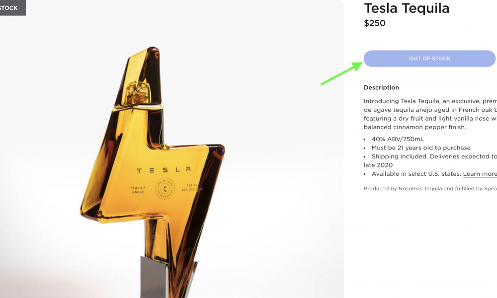 CRT ဘက်က ပယ်ချမှုကြောင့် Teslaquila တံဆိပ်ကနေ Tesla Tequila အဖြစ် ပြန်ပြောင်းခဲ့တာပါ။ ပုလင်းပုံစံကတော့ မိုးကြိုးသွားပုံစံ ခပ်ဆန်းဆန်းဒီဇိုင်းနဲ့ လာပါတယ်။ အယ်လ်ကိုဟောပါမှု ၄၀% ရှိတဲ့ Tesla Tequila ၇၅၀ မီလီလီတာ တစ်ပုလင်းကို ဒေါ်လာ ၂၅၀ နှုန်းနဲ့ ရောင်းချခဲ့တာပါ။ စပြီးရောင်းတဲ့ နိုဝင်ဘာပထမအပတ်မှာ ပစ္စည်းပြတ်တဲ့အထိ ရောင်းအားကောင်းခဲ့တယ်လို့ Tesla Tequila ဝက်ဘ်ဆိုက်မှာ ဖော်ပြထားပါတယ်။