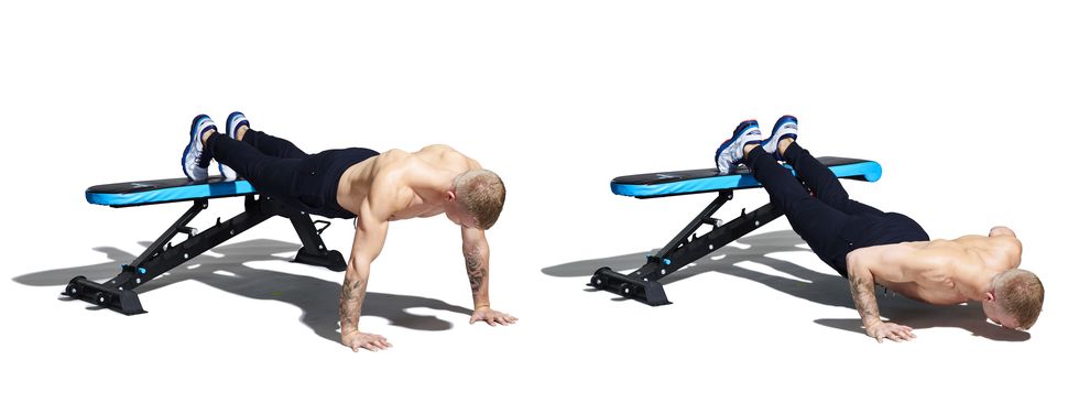 ဒီတစ်ခါမှာတော့ စောစောက လေ့ကျင့်ခန်း (၄) ရဲ့ ပြောင်းပြန်ပါ။ ခုံတန်းရှည် (သို့) ကုတင်ပေါ်မှာ ခြေထောက်တင်ထားပြီး လက်နှစ်ဖက်ကို ကြမ်းပြင်ပေါ်ချကာ ဒိုက်ထိုးရပါမယ်။ ၁၅ ကြိမ် (သို့) အကြိမ် ၂၀ ခန့် ပြုလုပ်ပါ။