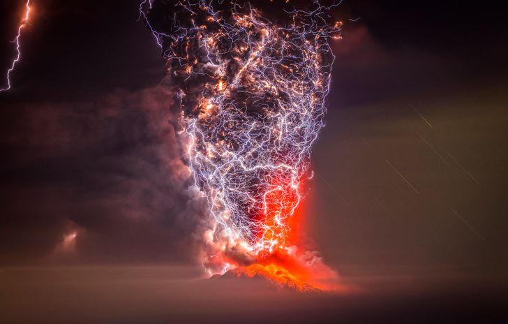 Calbuco (ကာလ်ဘူကို) မီးတောင် ပေါက်ကွဲနေချိန်မှာ လျှပ်စီးလျက်နေတဲ့ပုံပါ, ချီလီ
