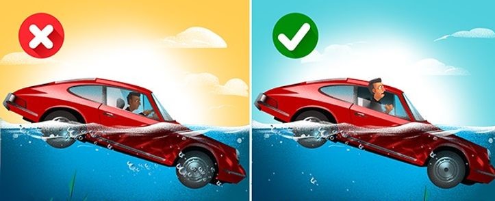 ဘာလို့လဲဆိုတော့ ရေထဲနစ်တော့မယ့် ကားထဲကနေထွက်ဖို့အတွက် အချိန်တစ်မိနစ်ပဲရပါတယ်။ ရေဖိအားကြောင့် ကားမှန်တံခါးကို ဖွင့်ဖို့ကြိုးစားနေတာက အချိန်ပိုကုန်ပါတယ်။ ဒါ့ကြောင့် ကားမှန်တံခါးကို မာတဲ့အရာတခုခု (ဥပမာ ဖြုတ်လို့ရတဲ့ ကားထိုင်ခုံခေါင်းမှီ) နဲ့ ရိုက်ခွဲဖို့ကြိုးစားပါ။