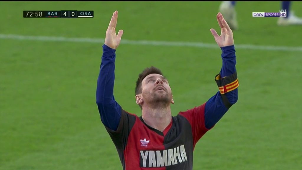 ဂိုးသွင်းအပြီးမှာ မက်ဆီဟာ သူ့ရဲ့ဂျာစီကို ချွတ်ပြီး ကျောနံပါတ် (၁၀) ပါ Newell’s Old Boys အသင်းရဲ့ ဂျာစီကို ပြသပြီး မာရာဒိုနာကို ဂုဏ်ပြုခဲ့ပါတယ်။ မာရာဒိုနာဟာ Newell’s Old Boys အသင်းမှာ တစ်နှစ်သာကစားခဲ့ဖူးပြီး ကျောနံပါတ် (၁၀) ဝတ်ဆင်ကစားခဲ့ပါတယ်။ ဘာစီလိုနာ-အိုဆာဆူနာ ပွဲစဉ်တွင် ဘာစီလိုနာအသင်းအတွက် ဂိုးကို ဂရေ့ဇ်မန်း၊ ကော်တင်ညို၊ ဘရိတ်ဝိတ် နဲ့ မက်ဆီတို့က သွင်းယူပေးခဲ့တာပါ။