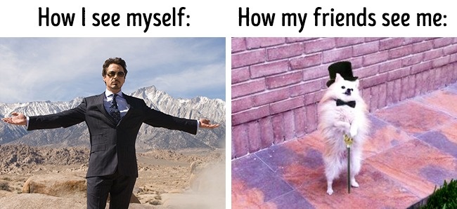 အဝတ်အစားအသစ်ဝတ်ပြီး သူငယ်ချင်းတွေနဲ့ သွားတွေ့သောအခါ (မိမိကိုယ်ကိုမိမိမြင်ပုံ vs သူငယ်ချင်းတွေ မိမိကို မြင်ပုံ)