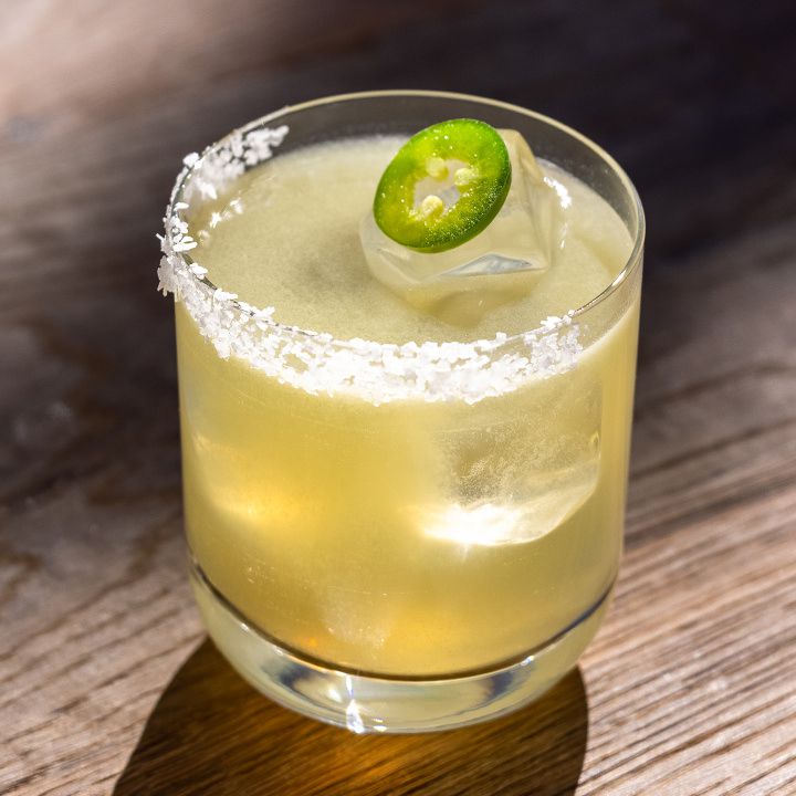 Spicy Margarita ကော့လ်တေးဖျော်စပ်ဖို့ Blanco Tequila ၊ Orange Liqueur ၊ Lime Juice ၊ Agave Syrup ၊ Jalapeno ငရုတ်ပွ ၊ ဆား နဲ့ သံပုရာခြမ်းတို့ လိုအပ်ပါတယ်။ အရင်ဆုံး ကော့လ်တေးဖန်ခွက်ရဲ့ နှုတ်ခမ်းကို သံပုရာခြမ်းနဲ့ ပွတ်ပြီး ဆားပန်းကန်ထဲမှာ လှိမ့်လိုက်ပါ။ ပြီးရင် အကွင်းလိုက်လှီးဖြတ်ထားတဲ့ Jalapeno ငရုတ်ပွကို ၂ – ၃ ကွင်းကို ကော့လ်တေး Shaker ထဲထည့်ပြီး Muddler နဲ့ ထိုးချေပေးပါ။