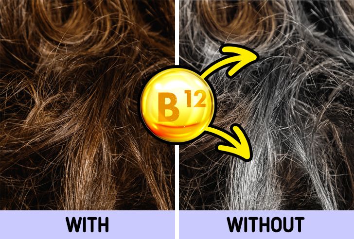 ကျွမ်းကျင်သူတွေရဲ့ ပြောဆိုချက်အရ ဗီတာမင် B12  ချို့တဲ့မှုဟာ အရွယ်မတိုင်ခင် ဆံပင်ဖြူရတဲ့ အဓိကအကြောင်းအရင်း ဖြစ်တယ်လို့ သိရပါတယ်။ ဆံပင်ပါးတာ၊ ဆံပင်ကျွတ်တာတွေကိုလည်း ဖြစ်စေနိုင်ပါတယ်။ ဒီလိုတွေမဖြစ်ဖို့အတွက် ဗီတာမင် B12 ကြွယ်ဝတဲ့ ကြက်ဥ၊ အမဲသား၊ တူနာ၊ ဆာလ်မွန်ငါးတွေကို စားသုံးပေးဖို့ လိုအပ်ပါတယ်။ ဗီတာမင် B12 ပါဝင်တဲ့ အားဖြည့်ဆေးကိုလည်း သောက်သုံးပေးလို့ရပါတယ်။